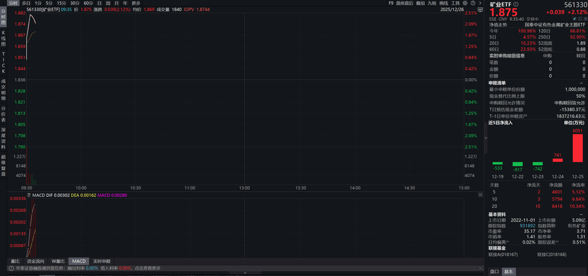 矿业ETF(561330)涨超2%,昨日资金净流入超6000万元,铜矿供需格局变化引关注