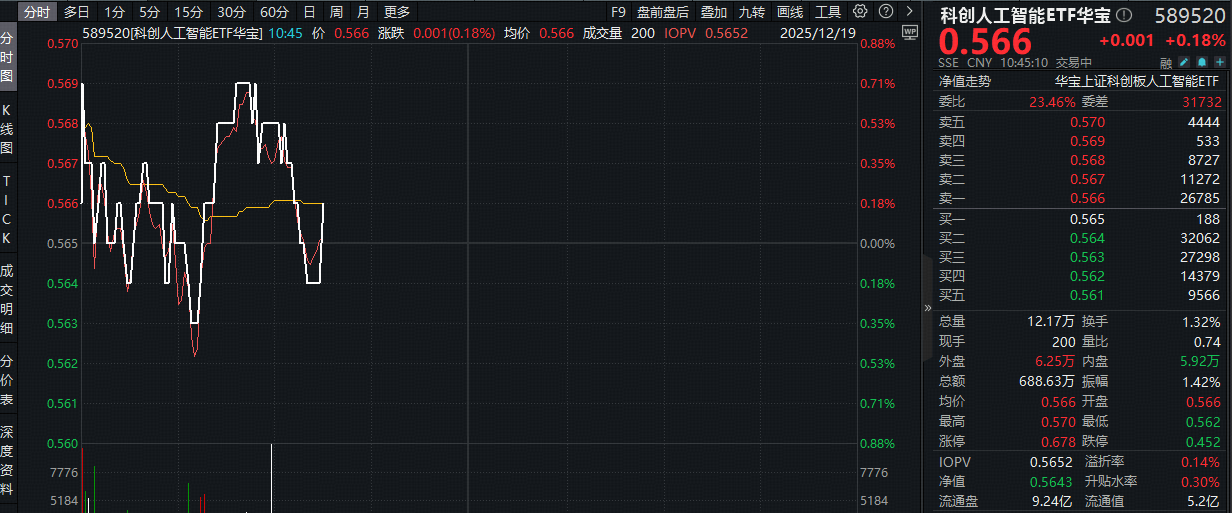 ETF盘中资讯|豆包大模型1.8正式发布+字节大会召开!字节产业链含量33%的科创人工智能ETF(589520)盘中摸高0.7%