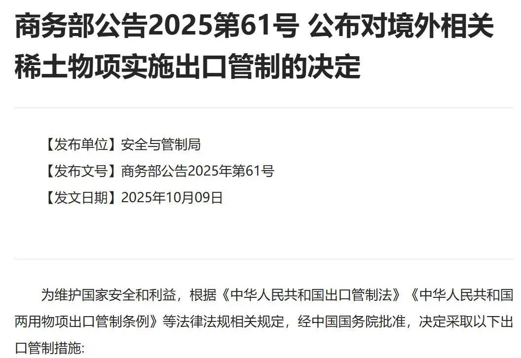 据商务部网站,稀土相关物项具有军民两用属性,对其实施出口管制是国际通行做法。今年4月,中国 政府对部分稀土物项实施出口管制。有关稀土技术早在2001年已经列入《中国禁止出口限制出口技术目 录》。相关出口需遵守法律程序要求。 新闻发言人介绍道,今年以来,国家出口管制工作协调机制办公室组织开展打击战略矿产走私出口专项 行动,取得积极成效。同时,有关部门也发现部分境外组织和个人从中国非法获取稀土技术,生产稀土 相关物项并提供给军事等敏感领域用户或者用于军事等敏感领域用途,对中国国家安全和利益造成重大 损害或潜在威胁,对国际和平稳定造成不利影响。为防范相关风险,中国政府经审慎评估后,决定对稀 土相关技术实施出口管制,同时对中国组织和个人从事相关活动作出明确规定,以更好维护国家安全和 利益,更好履行防扩散等国际义务,同时也保障全球稀土产业链供应链安全稳定。 南都讯 记者杨文君发自北京 10月9日上午,商务部发布两项关于加强稀土相关物项出口管制的公告,即 《商务部公告2025第61号公布对境外相关稀土物项实施出口管制的决定》和《商务部公告2025第62号公 布对稀土相关技术实施出口管制的决定》。商务部新闻发言人就公告相关 ...