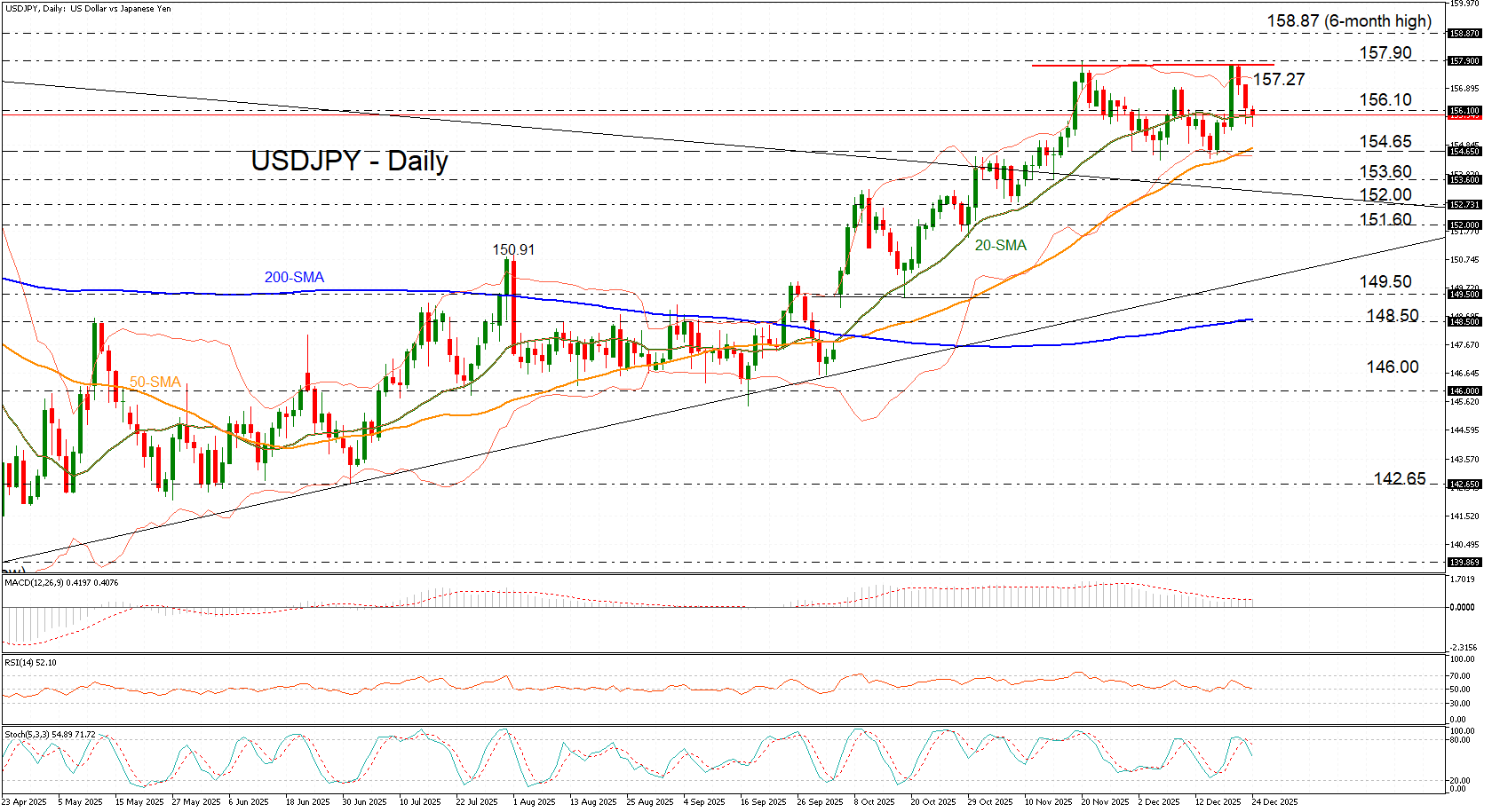 市场走势 - 美元/日元连续第三个交易日下跌,延续了从157.90以来的三天回调走势,形成看跌双顶形态 [1][3] - 汇价目前正在测试20日简单移动平均线附近的155.70支撑位 [1][3] - 跌破20日简单移动平均线后,可能触及50日简单移动平均线附近的强劲支撑位154.65,该水平已限制跌幅超过一个月,并与布林带下轨重合 [3] 驱动因素 - 走势反映了日本央行和美联储的政策分歧 [3] - 投资者正在消化日本央行会议纪要,其中政策制定者讨论了进一步加息的必要性 [3] - 美联储降息预期上升继续对美元构成压力,尽管美国第三季度GDP数据显示经济增速达到两年来的最快水平,但这些预期并未改变 [3] 技术分析 - 动量指标维持中性至看跌倾向,证实了看跌基调 [1][3] - MACD指标正在回落至其红色信号线下方,但仍高于零轴 [3] - RSI指标倾向于跌破50的中性水平 [3] - 随机指标已从超买区域形成看跌交叉 [3] - 布林带正在收窄,价格在突破上轨后回落 [3] 关键价位 - 下行目标:跌破154.65后,下一个目标是11月14日的低点153.60附近,随后是10月和9月的低点,分别约为152.00和151.60 [3] - 上行目标:如果反弹,目标可能是布林带上轨附近的157.27,随后是157.90以及六个月高点158.87附近 [4] 市场状态 - 美元/日元正在失去动能,测试收窄的布林带中线,表明在下一个决定性走势出现之前,市场处于观望状态 [4] - 该货币对需要守住155.70附近的强劲支撑位,以限制进一步的下行风险 [4]