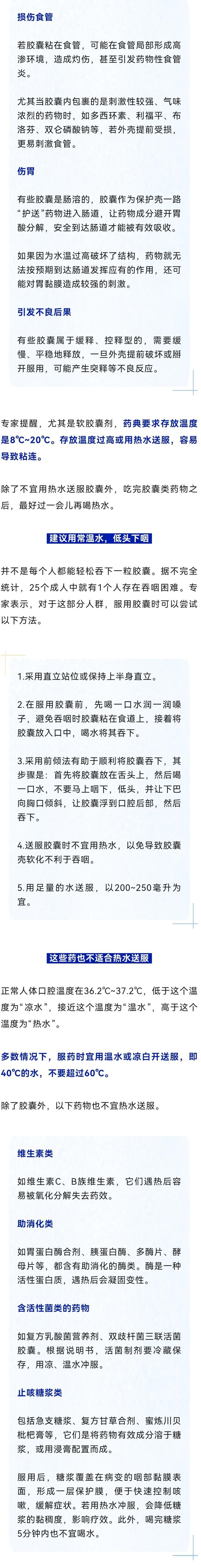 从小到大,几乎人人都吃过"胶囊"这类药物。服药时,一杯热水十分贴心,但在医生看来,「用热水送 服胶囊」反而是个危险的操作。 损伤食管 若胶囊粘在食管,可能在食管局部形成高渗环境,造成灼伤,甚至引发药物性食管炎。 尤其当胶囊内包裹的是刺激性较强、气味浓烈的药物时,如多西环素、利福平、布洛芬、双仑磷酸钠 等,若外壳提前受损,更易刺激食管。 2 《生命时报》邀请专家解读其中的原因,并提醒你哪些药物不宜热水送服。 吃胶囊药,不要用热水送服 上海交通大学医学院附属瑞金医院药剂科副主任石浩强介绍,胶囊是临床常见的药物剂型,约占医生开 具处方的20%,但它有个弱点——怕热水。 根据胶囊"囊材"的不同,可分为明胶胶囊和植物胶囊。其中,明胶是应用最多的成囊材料,这是一种蛋 白质制品,成分中85%~90%为蛋白质,不溶于冷水,但容易在温水和热水中溶解。 有试验发现,胶囊在50℃的水里浸泡10秒钟,就会变软、变黏稠。哪怕胶囊外壳只是化了一部分,也会 变得像粘了一块泡泡糖一样,拉丝、发黏。 胶囊长时间和食管接触、在错误位置溶解、药物提前释放,可能会带来以下健康风险。 1 伤胃 有些胶囊是肠溶的,胶囊作为保护壳一路"护送"药物进入肠道 ...