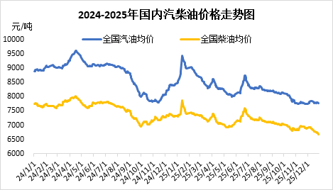 四季度期间,国际油价整体呈现震荡下行趋势,消息面缺乏提振。同时,新能源发展势头强劲,对于市 场需求面打压明显。基本面表现欠佳,国内成品油市场亦呈现弱势运行,汽柴均价同环比双跌。据金联 创数据统计,四季度全国主营0#柴油均价6872元/吨,环比下跌265元/吨,跌幅3.71%;同比下跌356元/ 吨,跌幅4.92%;92#汽油四季度均价7826元/吨,环比下跌406元/吨,跌幅4.93%;同比下跌244元/吨, 跌幅3.03%。 消息面及需求面双重利空国内成品油市场弱势运行 四季度,国际油价整体呈现震荡下行走势。季度前期,市场因IEA预警的严重供应过剩、中东局势缓和 以及贸易紧张而承压下行,随后又因美俄关系恶化带来的制裁风险及中美谈判缓和而短暂反弹。进入11 月后,结构性供应过剩成为持续压制油价的核心因素,叠加乌克兰等地缘风险溢价消退,油价重归跌 势;尽管季度末美国对委内瑞拉加大制裁与油轮扣押为市场提供了有限支撑,但未能改变全季供过于求 主导下的下行基调。 国际油价走势偏弱,四季度期间国内成品油零售呈现"一涨,五跌"局面,汽柴油分别累计下跌510元和 490元,终端零售价格较三季度进一步下滑。与此同时,国内汽柴 ...