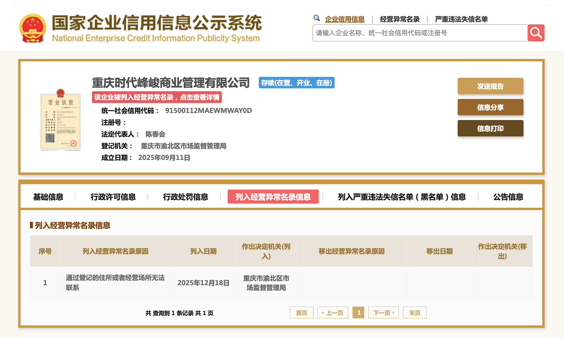 时代峰峻旗下一公司经营异常 成立仅3个月