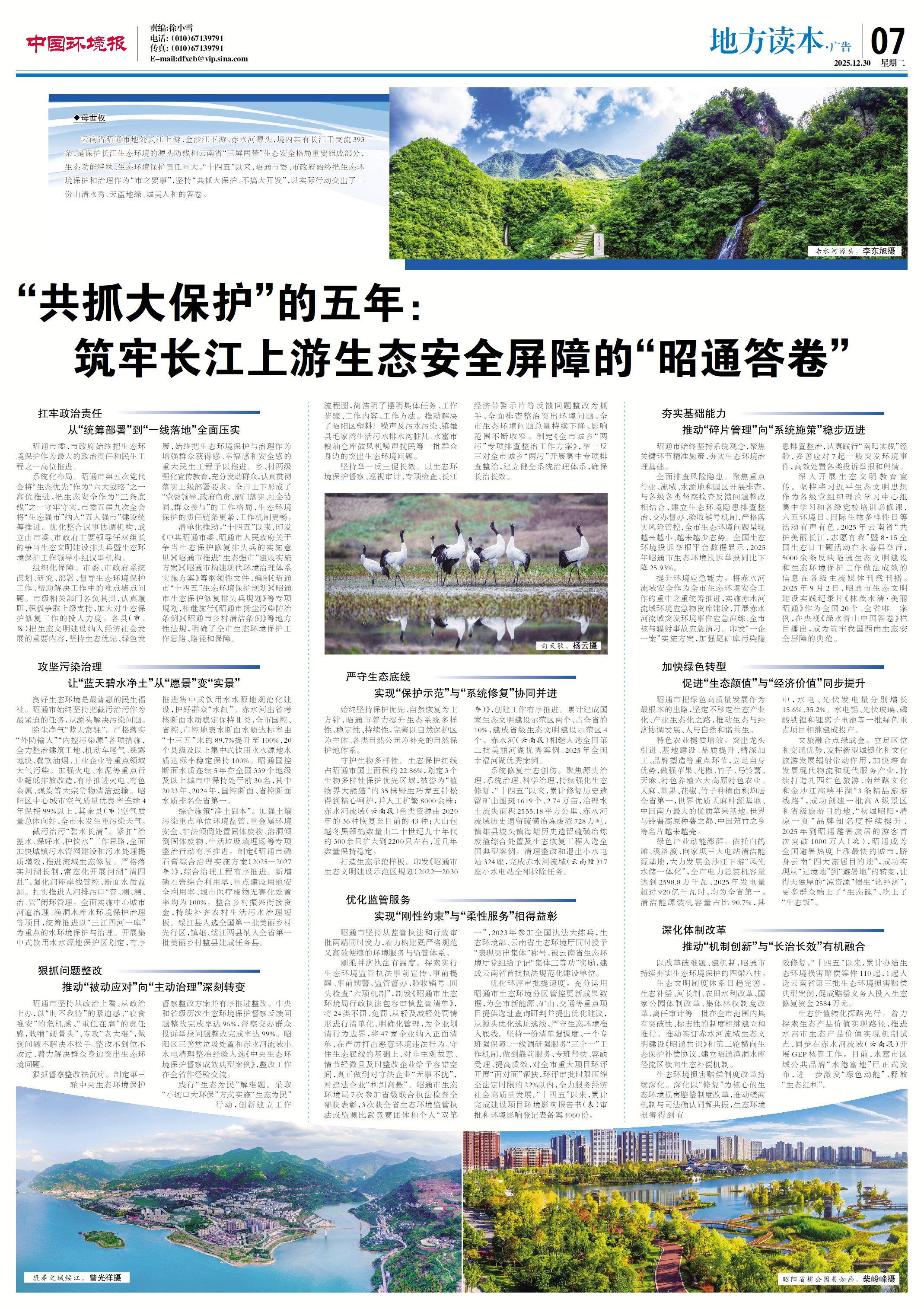 责编:徐小雪 电话:(010)67139791 传真:(010)67139791 E-mail:dfxcb@vip.sina.com ◆母世权 云南省昭通市地处长江上游、金沙江下游、赤水河源头,境内共有长江干支流 393 条,是保护长江生态环境的源头防线和云南省"三屏两带"生态安全格局重要组成部分, 生态功能特殊、生态环境保护责任重大。"十四五"以来,昭通市委、市政府始终把生态环 境保护和治理作为"市之要事",坚持"共抓大保护、不搞大开发",以实际行动交出了一 份山清水秀、天蓝地绿、城美人和的答卷。 "共抓大保护"的五年: 筑牢长江上游生态安 扛牢政治责任 从"统筹部署"到"一线落地"全面压实 昭通市委、市政府始终把生态环 境保护作为最大的政治责任和民生工 程之一高位推进。 系统化布局。昭通市第五次党代 会将"生态优先"作为"六大战略"之一 高位推进,把生态安全作为"三条底 线"之一守牢守实,市委五届九次全会 将"生态强市"纳入"五大强市"建设统 筹推进。优化整合议事协调机构,成 立由市委、市政府主要领导任双组长 的争当生态文明建设排头兵暨生态环 境保护工作领导小组议事机构。 组织化保障。市委、市政府系统 谋 ...