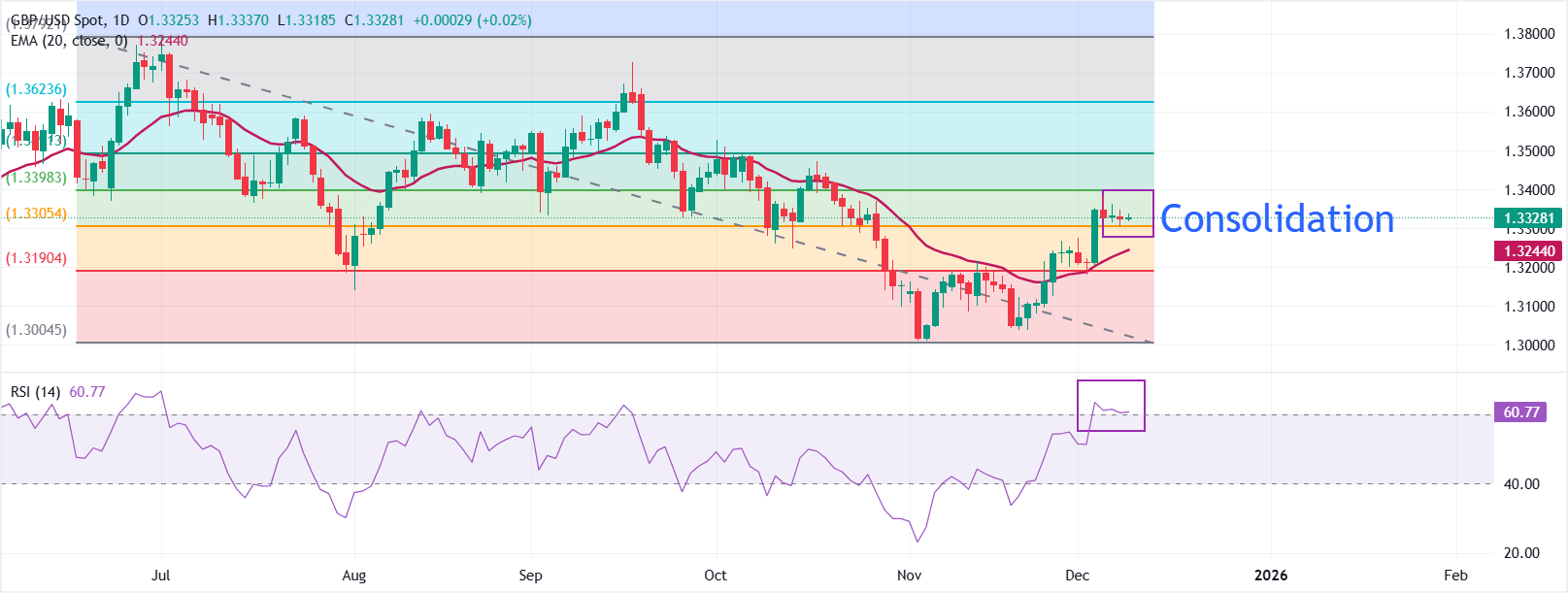 英镑兑美元当前坚守200日均线1.3350关键支撑位,长期多头基础仍在。日线级别显示,RSI指标处于中 性区间,MACD红柱略减,反映短线缺乏明确方向,震荡整理特征明显。 全球风险情绪略有回落,为美元提供部分避险支撑,但美元多头整体谨慎,缺乏激进买盘。11月以来英 镑兑美元累计反弹近3%,从1.300附近攀升至当前高位,部分获利盘有了结需求,叠加关键事件前的观 望情绪,限制了汇价短期波动空间。 英国央行方面,本周四将召开12月议息会议,市场普遍预期将维持5.25%的基准利率不变。当前市场定 价显示,英国央行12月降息概率仅为10%,2026年底前预期降息61个基点,政策路径相对稳健,为英镑 提供一定支撑。 美联储方面,12月完成年内第三次降息,联邦基金利率区间下调至3.5%-3.75%,但会议出现3票反对 票,政策分歧创下2019年以来新高。鲍威尔表态偏谨慎,未释放2026年明确降息指引,仅强调政策"高 度依赖经济数据",市场对其明年降息预期有所降温,间接影响英镑兑美元走势。 英国方面,本周将迎来密集数据发布,今日公布月度就业数据,周三披露CPI数据,周四同步迎来央行 政策会议。这些数据将直接反映英国经济复苏 ...