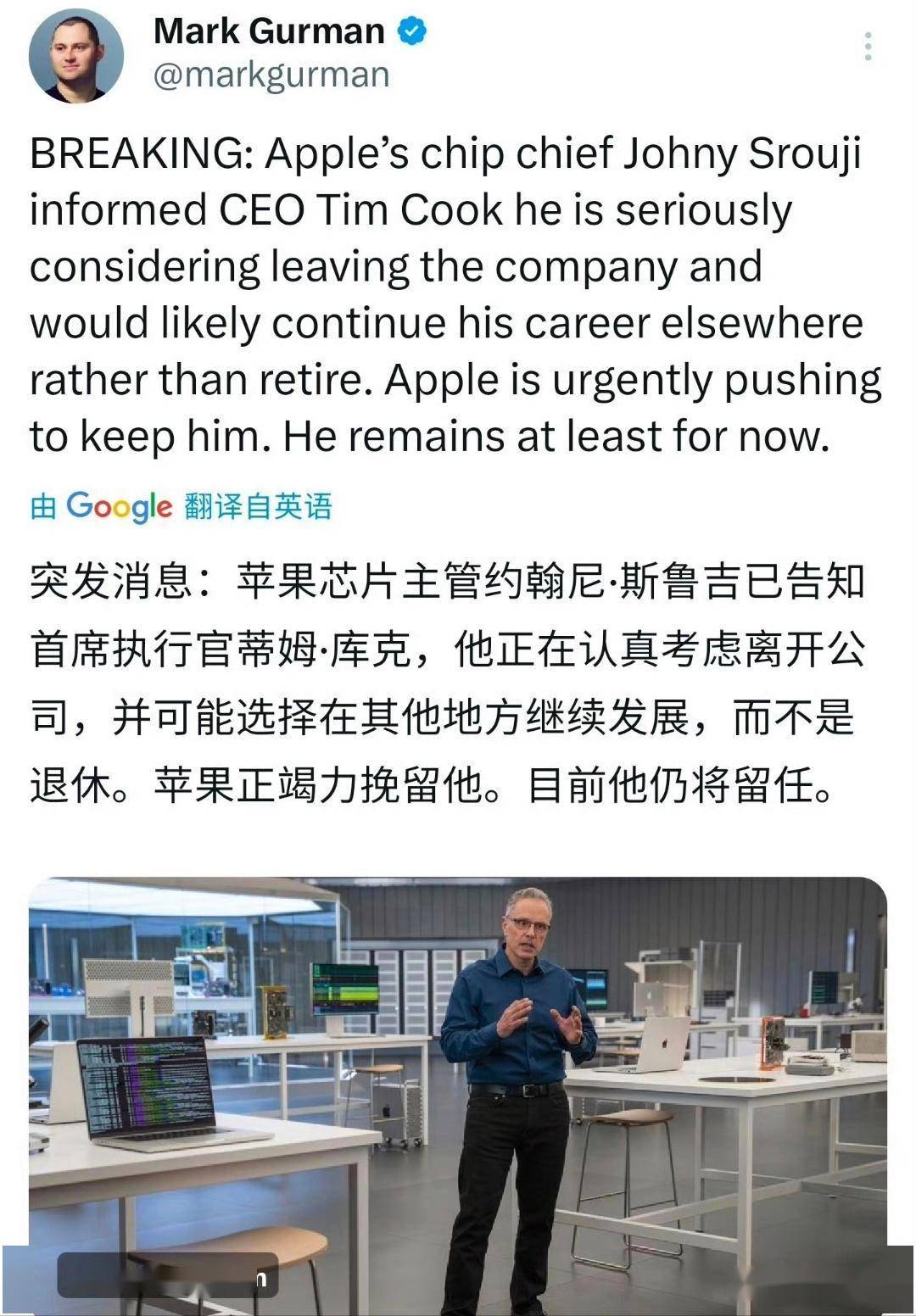核心事件 - 苹果公司芯片业务主管约翰尼・斯鲁吉已告知首席执行官蒂姆・库克,其正在认真考虑离开公司 [1][3][4] - 该主管的离职意向并非计划退休,而是可能选择在其他公司继续其职业生涯 [1][3][4] - 苹果公司正紧急采取行动,试图挽留该名关键高管 [3][4] - 截至目前,该主管仍暂时留任于公司 [3][4] 公司人事动态 - 近期苹果公司内部出现多名员工选择辞职的情况 [1]