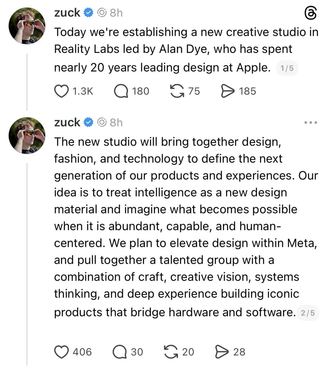 核心人事变动 - Meta任命苹果前用户界面设计副总裁艾伦·戴伊为首席设计官,自12月31日起生效 [5][9] - 戴伊在苹果工作19年,曾负责Apple Watch、Vision Pro头显及iOS 26液态玻璃视觉系统等关键产品的设计工作 [6][7][9] - 戴伊的重要副手、苹果设计团队高级总监比利·索伦蒂诺将同时加入Meta [6][9] 职位职责与汇报关系 - Meta将为戴伊建立新设计工作室,其将全面负责硬件、软件及AI界面整合的设计工作 [5][9] - 戴伊将直接向Meta首席技术官安德鲁·博斯沃思汇报,Meta现任多位设计负责人将向戴伊汇报 [5][9] - 戴伊的核心任务是将AI功能整合进Meta的硬件设备体系 [9] 行业人才竞争态势 - 此次是Meta今年第二次从苹果挖走核心人才,7月曾高薪挖走苹果基础模型团队杰出工程师兼经理庞若鸣 [6][10] - Meta已从OpenAI、谷歌、Anthropic等其他企业挖来大量顶尖AI人才 [10] - 硅谷AI人才争夺战愈演愈烈,此次人事变动是Meta全力押注AI硬件和超级智能的表现 [12] 对苹果公司的影响 - 苹果设计团队自2019年前首席设计师乔尼·艾维离职后出现人才流失趋势,今年已有包括iPhone Air设计师在内的多位核心成员离职 [10] - 苹果AI业务主管约翰·詹南德雷亚于本周宣布卸任,苹果硬件工程高级副总裁约翰·特努斯被传可能接替库克出任CEO [6][11] - 核心成员接连流失为苹果即将发布的新版Siri、下一代iPhone Air及折叠屏iPhone等新品的研发带来不确定性 [12]