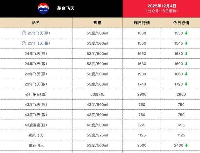 核心观点 - 2025年12月4日,茅台主力产品飞天茅台多个年份及规格的批发价格出现同步下调,市场供需关系承压,引发产业链各环节参与者调整策略 [1][3][8] 价格变动详情 - **24年飞天茅台**:原箱价格较前一日下跌30元至1630元/瓶,散瓶价格下跌30元至1600元/瓶,原箱与散瓶价格同时下行显示该年份产品在供需两端均承受压力 [1][2] - **23年飞天茅台**:原箱价格较前一日下跌40元至1860元/瓶,散瓶价格下跌20元至1720元/瓶,不同规格跌幅不一,显示流通端操作存在差异 [1][2] - **25年飞天茅台**:原箱价格较前一日下跌10元至1550元/瓶,散瓶价格下跌5元至1545元/瓶,价格在所有年份中最低 [2] - **其他产品**:散花飞天价格下跌100元至2400元/瓶,而公斤茅台、43度系列及翼风飞天等产品价格保持稳定 [2] - **价格结构**:市场对不同年份和渠道的产品估值清晰,23年原箱价格最高(1860元/瓶),24年次之,25年最低,形成明显价格梯度 [2] 市场动态与参与者反应 - **价格信号来源与传导**:价格信息首先从“今日酒价”等批发监测站点流出,经智通财经等媒体整理发布,多个主力年份产品价格同步下调表明市场存在共识或预期走弱 [3][6][8] - **经销商反应分化**:部分经销商选择快速出货变现以减轻库存压力,部分则选择观望维稳,认为短期波动不影响长期策略,导致不同网点和城市间出现价格差异 [5] - **资金端策略差异**:短线投机者倾向于抛售现货以期在回调时买回,而长期持有者更为镇定,更看重产品的年份与渠道的持久价值 [5] - **消费者层面影响**:散瓶价格下跌抑制日常购买冲动,原箱价格下跌影响礼赠和收藏需求,两端同时走弱对市场购买力形成压制 [6] 市场影响与后续展望 - **成交与流动性**:价格下调导致中短期市场成交活跃度预计将增高,卖方为换取现金流愿意接受略低价格,买方则在观望,市场短线换手频繁,不同城市和渠道间价格出现跳动 [7] - **市场情绪**:买卖双方均趋于谨慎,卖方担忧库存滞压,买方担忧价格进一步下跌,12月4日的报价提醒市场即使如茅台这类标品也存在价格波动 [7] - **后续观察点**:此次多年份产品价格齐跌是一个明显信号,市场后续将重点关注成交量和区域差价,短期内价格仍有微调可能,12月4日的价格已成为新的市场参考点 [8]