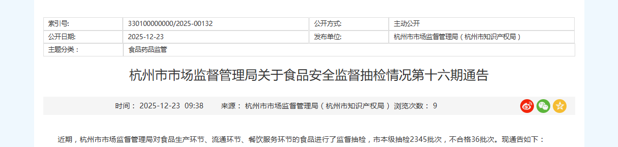 杭州市市场监督管理局关于食品安全监督抽检情况第十六期通告