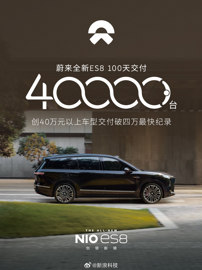 【#蔚来ES8上市100天交付破4万台# ,成为40万元以上不分能源形式,交付最快"破四万"的车型。】# 蔚来12月交付量# 12月29日,蔚来ES8交付量突破40000台,历时仅100天,创下40万元以上车型交付破 四万的最快纪录。自9月21日交付起,交付量逐步攀升,从1万台到4万台的交付间隔时间持续缩短,整 体交付进程稳步推进。据悉,全新ES8在11月交出10677台的交付成绩,位列当月新能源SUV销量第 二、纯电SUV销量首位。从用户换购情况来看,该车的增换购用户中,有超六成来自传统豪华燃油车品 牌,其中近半数为BBA车主,同时也吸纳了部分新能源品牌的换购用户,体现出高端新能源车型的市 场受众覆盖面逐步拓宽。 蔚来全新ES8 100天交付 创40万元以上车型交付破四万最快纪录 创 新 领 境 6 @新浪科技 ...
