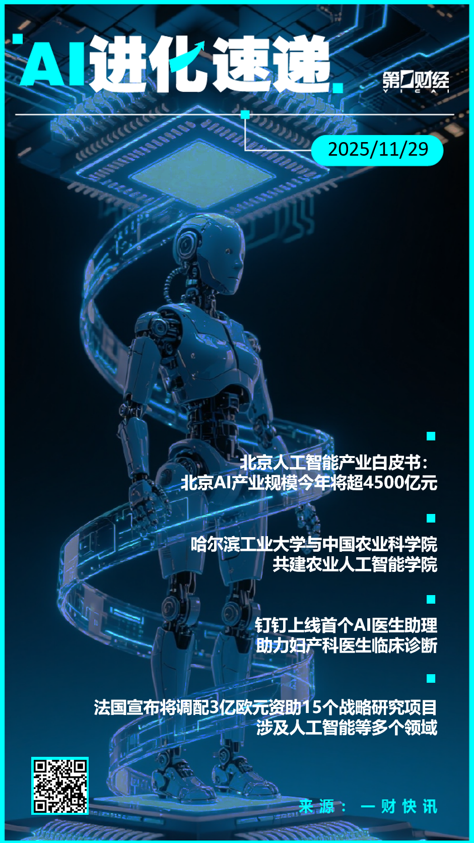 北京人工智能产业规模 - 北京AI产业规模预计今年将超过4500亿元 [1] 人工智能在农业领域的应用 - 哈尔滨工业大学与中国农业科学院合作共建农业人工智能学院 [1][3] 人工智能在医疗领域的应用 - 钉钉上线首个AI医生助理“豆蔻医生超级助理”,旨在助力妇产科医生进行临床诊断 [1][3] 国际人工智能研究资助 - 法国宣布将调配3亿欧元资金,用于资助15个战略研究项目,其中涉及人工智能等多个领域 [1][4]