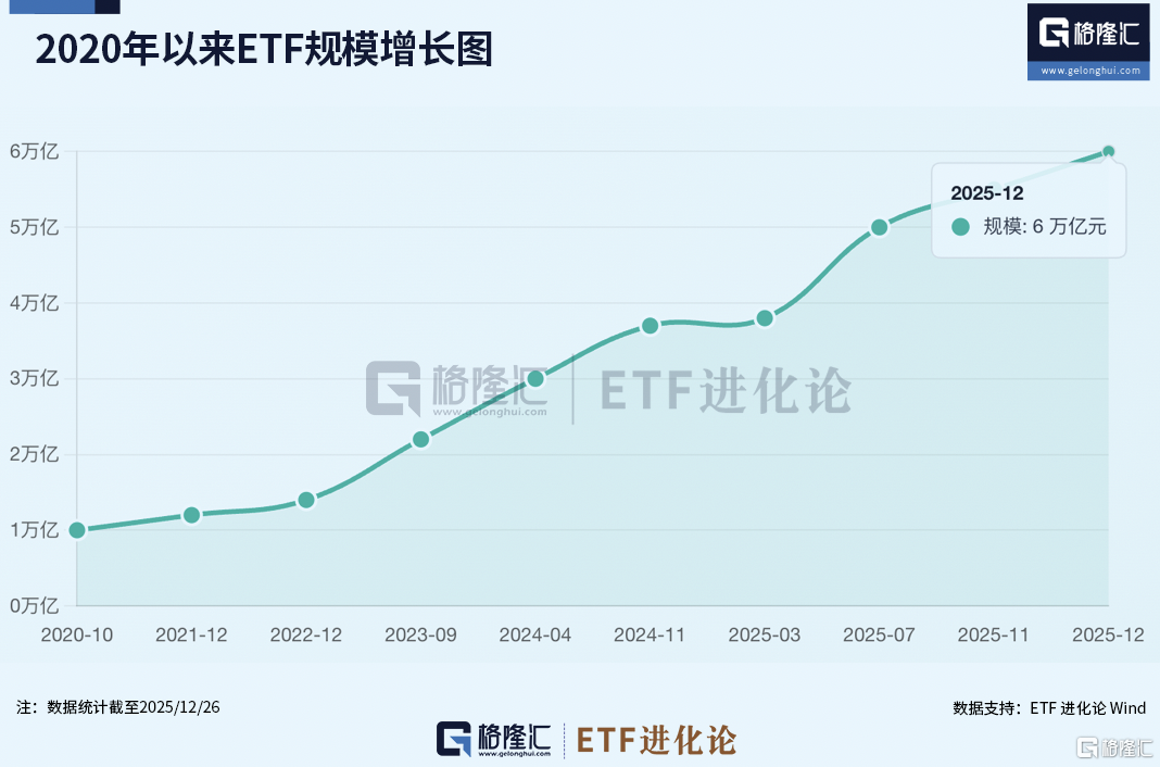 刚刚见证历史! 当上市公司因买私募基金爆亏81%而报案的消息震惊全场时,国内ETF市场再创里程碑式记录,历史首次迈向6万亿时代,创突破万亿关口史上最快纪 录! 在A股创近10年新高之际,ETF市场突破6万亿,不仅是一个数字的巅峰,更是一个时代的注脚,以前所未有的姿态重塑金融市场。 站在岁末年初的转折时点,基金君将从ETF规模增长、ETF功能、产品发行与创新、投资者结构、资金流向等来盘点中国ETF在2025年的七大变化。 登顶亚洲,国内ETF迈向6万亿时代 2025年12月26日,国内ETF规模历史首次突破6万亿元大关,达到6.03万亿元,较年初的3.73万亿元增长62.6%,年内净增2.29万亿元。 今年ETF连续突破4万亿(204天)、5万亿(131天)、6万亿(122天)三大关口,呈现加速度爆发姿态,从5万亿到6万亿仅用4个月,创突破万亿关口史 上最快纪录! 2025年8月,国内ETF市场以6810亿美元规模超越日本的6680亿美元,取代日本成为亚太地区ETF之王,成为亚洲最大ETF市场! 这不仅是数字上的超越,更蕴含着被动投资深刻重塑中国金融生态的信号。 从此,国内资本市场的图谱上,一个属于ETF的黄金 ...