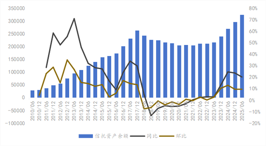 来源:中国信托业协会 原标题:2025年度上半年中国信托业发展评析 2025年上半年,面对国际环境复杂多变、外部压力明显加大的挑战,国内经济凭借强劲韧性顶住压力、 迎难而上,整体运行呈现"总体平稳、稳中向好"的良好态势,上半年国内生产总值(GDP)达66.05万 亿元,按不变价格计算同比增长5.3%,对全球经济增长贡献率已经连续十多年维持在30%左右。在此宏 观背景下,信托业继续围绕"三分类"政策进行业务布局,加大推进回归本源业务的转型发展力度,充分 挖掘服务实体经济和人民美好生活的信托功能,上半年成效显著,信托资产规模继续稳步增长,信托业 务结构持续优化,信托服务功能不断强化,整体经营业绩"稳中有升",信托业高质量发展的基础进一步 夯实。 一、信托资产规模继续稳步增长 自2018年起,因受市场环境变化与监管政策调整的影响,信托业步入了转型发展阶段,在清理压缩传统 业务(融资类信托和通道信托)的同时,积极拓展信托本源业务,全行业信托资产规模从2017年末 26.25万亿元的高位,回落至2020年末的20.49万亿元,三年间(2018-2020年)降幅达到21.94%。随着行 业逐步理清自身定位、加速回归本源业 ...