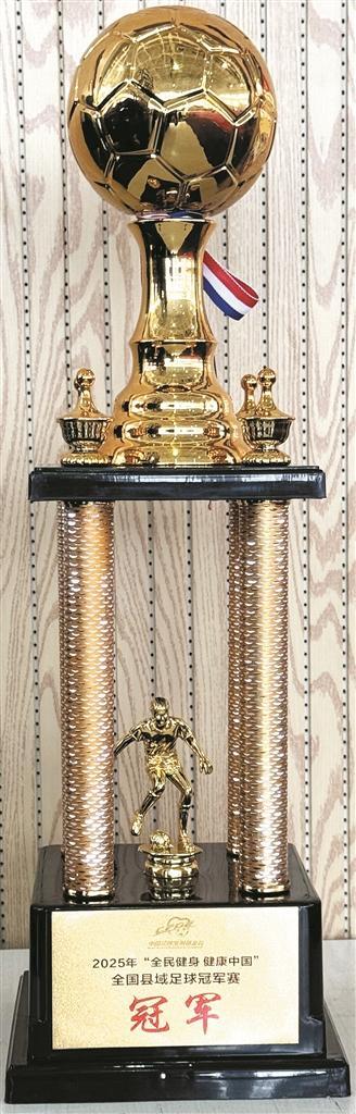 2025年"全民健身 健康中国"全国县域足球冠军赛冠军奖 杯(摄于12月29日)。 兵团日报全媒体记者 陈洋 摄 12月24日,兵团第八师石河子镇夺标队队员高举冠军奖杯庆祝胜利。 八师石河子市文化体育广电和旅 游局 提供 ●兵团日报全媒体记者 马燕 2025年12月24日,广西桂林,室内足球场的璀璨灯光如星芒倾泻,漫过青绿的人工草皮,映亮每一张紧 绷又专注的脸庞。当终场哨声穿透场馆内的喧嚣,瞬间被山呼海啸般的欢呼吞没,兵团第八师石河子镇 夺标队(以下简称"八师石河子镇夺标队")的队员们再也抑制不住激动的情绪,相拥着扑倒在草皮上, 滚烫的泪水混着拼搏的汗水肆意流淌。4∶1,他们战胜河南信阳息县众鑫足球队,将全国县域足球冠军 赛的桂冠稳稳收入囊中。 这是兵团足球史上首个全国冠军。领奖台上,来自石河子工程职业技术学院的少年们高高举起奖杯,金 属的光泽与他们通红的脸颊相映。从天山脚下的凛冽寒风,到漓江边的雨中鏖战,这支由汉族、维吾尔 族、哈萨克族、回族等多民族少年组成的队伍,以七战全胜的战绩,书写了一段团结与热爱交织的绿茵 传奇。 逆境破局 绿茵场上显锋芒 决赛决胜时刻,进攻核心阿卜杜克依木·吐尔地临危受命。他眼神坚 ...