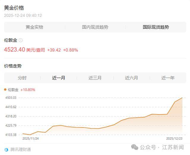 看看新闻记者: 王成 编辑: 王成 金价再一次用"加速度"证明了自己仍处在强势周期之中,12月23日,国际金银续创历史新高,COMEX黄金期货突破4480美元/盎司,周生生足金饰品标价 1403元/克,较前一日上涨36元/克。老庙黄金足金饰品标价1402元/克,较前一日的价格上涨35元/克。 从国际市场看,这一轮上涨并非"单点爆发",而是贵金属整体走强。黄金、白银、铂金齐涨,说明资金并非短期投机式涌入某一品种,而是在系统性配置避 险资产。在全球经济不确定性加剧的背景下,这种"全线抬升"的走势,往往意味着市场风险偏好下降,对安全资产的需求显著上升。目前来看,支撑金价的 核心逻辑并未发生大的改变:美联储降息预期升温,美元走弱,持有黄金机会成本降低;日本加息引发日元套息交易逆转,助推黄金买盘;全球央行前三季 度净购金超634吨,中国央行连续13个月增持,黄金作为"无主权信用风险"的资产,其配置价值被不断放大。 对于国内消费者而言,最直观的感受是买黄金首饰又贵了好多,若以一只30克左右的金手镯计算,一夜之间就要多花千元左右。而对普通投资者而言,当前 金价水平已经处于历史高位区域,参与方式更需要冷静和克制。一方面,黄金 ...