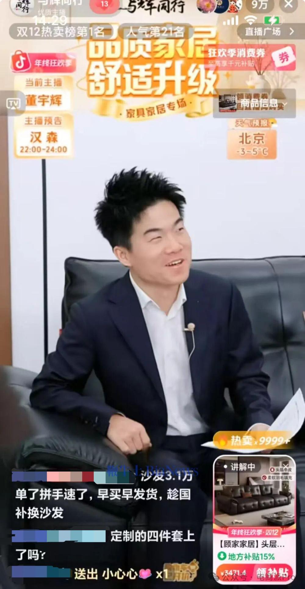 转载自电商派Pro 直播江湖风云变幻,更新换代频繁,董宇辉却是难得的"常青树"般的存在。 不久前,其"与辉同行"直播间开启家居专场,一举拿下3.56亿元的销售额,其中顾家家居的一款沙发单品,成交额更是突破1亿元。 这场长达五个半小时的直播,虽再度验证了董宇辉强大的带货实力,却也意外触发了一波前所未有的质疑声浪。 在流量为王的直播时代,顶流主播的任何细微举动都逃不过大众的审判。曾凭借文化底蕴圈粉无数,收获大批"丈母娘"粉丝支持的董宇辉,如今也面临着 巨大的争议。 董宇辉带货沙发陷入代工质疑 这一切的开始,要从12月10日的一场直播说起。 当晚,董宇辉"与辉同行"直播间进行了一场家居专场直播。这场持续五个半小时的直播创下了3.56亿元的总销售额,其中顾家家居一款真皮沙发单品成交 额突破1亿元,成为当日直播间的销售冠军。 董宇辉在直播中坐在该款沙发上向观众详细介绍,并将所有沙发类产品按价格排序,方便消费者"迅速做出判断",强调"消费这个事情就是量力而行,咱 们按需消费"。 77 : 900 · 讲解中 沙发3.1万 单了拼手速了,早买早发货,趁国 补换沙发 年终狂吹零 · 双12 定制的四件套上 【顾家家居】头层 ...
