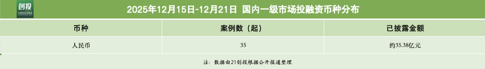 一句话趋势:科技与制造、医疗健康领域持续以案例密度和资金量级双优势主导融资市场。 过去一周,科技与制造领域以超20起案例、多笔5亿元级大额交易成融资核心:半导体设备企业新施诺完成超5亿元A+轮融资;通讯设备研发商昉擎科技斩 获超5亿元Pre-A轮融资;卫星通信企业星联芯通完成逾亿元B轮融资;智能特种机器人企业博清科技获数亿元B轮融资;二维半导体企业原集微完成近亿元 天使轮融资。 医疗健康领域稳健发力,大额交易与细分创新并行:新药研发服务平台康源博创完成2.5亿元B轮融资;恶性肿瘤创新药研发企业伯汇生物获近亿元A+轮融 资;AI驱动新药研发企业哲源科技完成亿级A+轮融资。此外,脑机接口企业阶梯医疗、眼病数字疗法企业集视科技、创新多肽药物研发商成都佩德生物等 细分场景企业均获资本加持,资金聚焦临床价值明确的创新领域。 消费服务领域无新增融资案例,整体延续"硬科技+医疗健康"双主线主导的市场格局。 02、哪些投资机构较为活跃 从机构投资活跃度来看,本周亦庄国投、国科投资较为活跃,各披露2笔投资,主要聚集在科技与制造领域与医疗健康领域。 | 刨投 | | 2025年12月15日-12月21日 国内一级市场活跃 | | ...