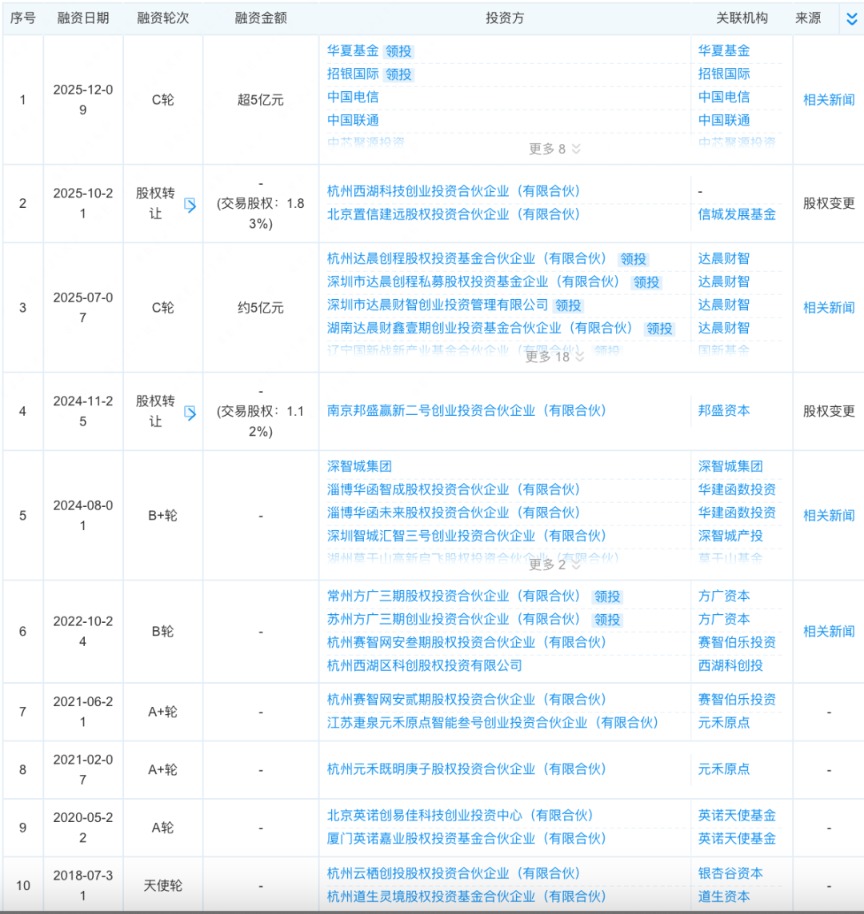 公司IPO进程 - 杭州云深处科技股份有限公司于2025年12月23日正式启动上市辅导,中信建投证券担任辅导机构 [1] - 公司上市辅导时间为2025年12月至2026年6月,计划于2026年4月至6月向证监局提交辅导验收申请 [3] - 公司已于2025年11月3日完成股份制改造,企业类型变更为“其他股份有限公司(非上市)” [3] 公司背景与股权结构 - 公司成立于2017年11月29日,注册资本为823.4958万元,是一家国家级高新技术企业 [3] - 公司法定代表人为朱秋国,其为控股股东及实际控制人,与一致行动人合计控制公司32.60%的股份 [3] - 公司是“杭州六小龙”之一,该群体中已有3家冲刺IPO,其中宇树科技已于2025年11月完成上市辅导 [1] 主营业务与产品 - 公司聚焦具身智能技术创新与行业应用,专注于四足机器人、人形机器人及核心零部件的研发、生产、销售和服务 [3] - 公司产品线覆盖四足机器人绝影系列、轮足机器人山猫、以及人形机器人DR01和DR02 [3] - 2025年公司推出了轮足复合的四足机器人山猫M20和行业级人形机器人DR02,并建成具身智能中试基地 [6] 融资历史与最新进展 - 自成立以来,公司共经历10次融资,覆盖从天使轮到C轮的全生命周期 [6] - 2025年12月9日,公司宣布完成超5亿元C轮融资 [4][6] - C轮融资由招银国际和华夏基金联合领投,中国电信、中国联通旗下基金参与战略投资,并有云晖资本、中芯聚源等多家机构跟投,老股东达晨财智等继续加持 [6] 资金用途与发展战略 - C轮融资将为公司的技术研发、扩大产能及市场拓展提供资金保障 [6] - 融资旨在通过与产业属性投资方深度绑定,构建“技术—产业—场景”协同发展的新生态,推动具身智能机器人的商业化与规模化落地 [6] - 公司计划以此次融资为契机,推动具身智能技术从单点突破走向系统赋能 [6] 财务与业绩表现 - 2025年是公司快速发展的一年,公司实现了业绩快速增长 [6]