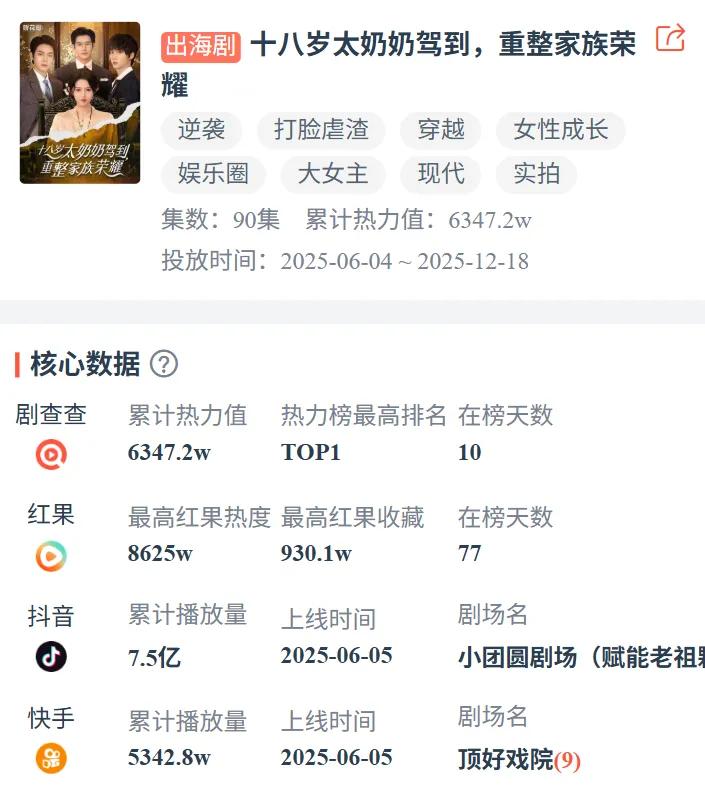 一、短剧行业精品化时代 进入2025年年底,随着微短剧成为融入一代国民的大众娱乐消费,行业竞争与方向转变也持续深化:规模化、精品化、版权竞争等成为新亮点,各大爆款 短剧也层出不穷。 今年以来,《好一个乖乖女》、《十八岁太奶奶驾到,重整家族荣耀》、《盛夏芬德拉》等作品接连爆火,先后打破播放量纪录。 《好一个乖乖女》成为红果平台首部收藏量破千万短剧;《十八岁太奶》热度持续至今,并成为爆款系列剧,第四部已开启预约;《盛夏芬德拉》上线17 天播放量突破30亿成功破圈。 | 剧查查 | 累计热力值 热力榜最高排名 在榜天数 | | | | --- | --- | --- | --- | | O | 6347.2w | TOP1 | 10 | | 红果 | 最高红果热度 最高红果收藏 在榜天数 | | | | O | 8625w | 930.1w | 77 | | 抖音 | 累计播放量 | 上线时间 | 剧场名 | | € | 7.5亿 | 2025-06-05 | 小团圆剧场(赋能老祖鼎 | | 快手 | 累计播放量 | 上线时间 | 剧场名 | | 8 | 2025-06-05 5342.8w | | 顶好戏院(9) ...
