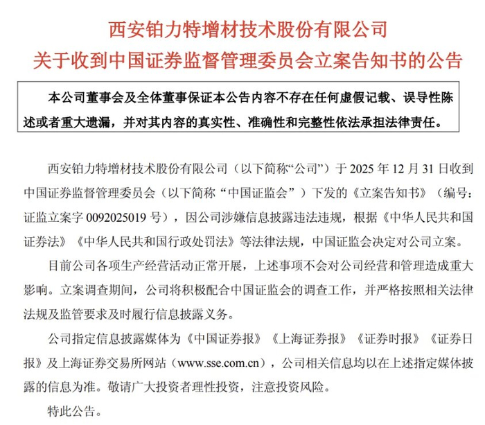 登录新浪财经APP 搜索【信披】查看更多考评等级 专题:专题:价值重估 行稳致远——年终盘点&2026资本市场展望 行情图 热点栏目 自选股 数据中心 行情中心 资金流向 模拟交易 客户端 兄弟们,商业航天概念板块又来利空,又一只牛股被立案调查。 铂力特:因涉嫌信息披露违法违规被中国证监会立案 12月31日晚间,铂力特公告称,公司于2025年12月31日收到中国证监会下发的《立案告知书》,因公司涉嫌信 息披露违法违规,中国证监会决定对公司立案。目前公司各项生产经营活动正常开展,上述事项不会对公司经 营和管理造成重大影响。立案调查期间,公司将积极配合中国证监会的调查工作,并严格按照相关法律法规及 监管要求及时履行信息披露义务。 证券代码:688333 证券简称:铂力特 公告编号:2026-001 西安铂力特增材技术股份有限公司 关于收到中国证券监督管理委员会立案告知书的公告 本公司董事会及全体董事保证本公告内容不存在任何虚假记载、误导性陈 述或者重大遗漏,并对其内容的真实性、准确性和完整性依法承担法律责任。 来源:中国基金报 【导读】铂力特:因涉嫌信息披露违法违规被证监会立案 西安铂力特增材技术股份有限公司(以 ...