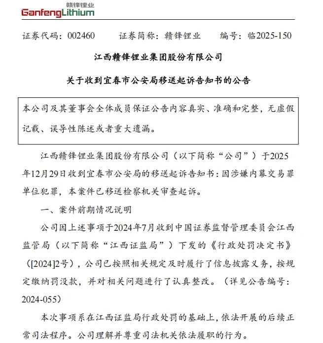 锂矿龙头之一的赣锋锂业突发公告。 12月29日晚间,江西赣锋锂业集团股份有限公司(以下简称"赣锋锂业")发布公告称,公司于12月29日 收到宜春市公安局的移送起诉告知书:因涉嫌内幕交易罪单位犯罪,该案件已移送检察机关审查起诉。 | 赣锋锂业 | | --- | | GanfengLithium | 赣锋锂业表示,截至目前,公司各项生产经营活动保持正常有序运行。本次涉案事项为赣锋锂业前期已 披露的特定历史事件,预计不会影响赣锋锂业正常的生产经营。 公告中的案件前期情况说明显示,赣锋锂业因上述事项于2024年7月收到中国证券监督管理委员会江西 监管局(以下简称"江西证监局")下发的《行政处罚决定书》,公司已按照相关规定及时履行了信息披 露义务,按规定缴纳罚没款,并对相关问题进行了认真整改。 赣锋锂业表示,本次事项系在江西证监局行政处罚的基础上,依法开展的后续正常司法程序。公司理解 并尊重司法机关依法履职的行为。 历史公告显示,2024年7月,因涉嫌内幕交易"*ST江特"股票,江西证监局对赣锋锂业及公司时任董事 长、总裁李某彬、时任董事会秘书欧某明予以行政处罚。江西证监局没收赣锋锂业违法所得110.53万 元,并处 ...