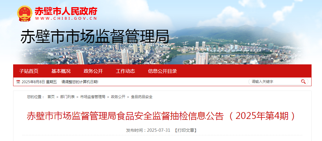 湖北省赤壁市市场监督管理局食品安全监督抽检信息公告 (2025年第4期)