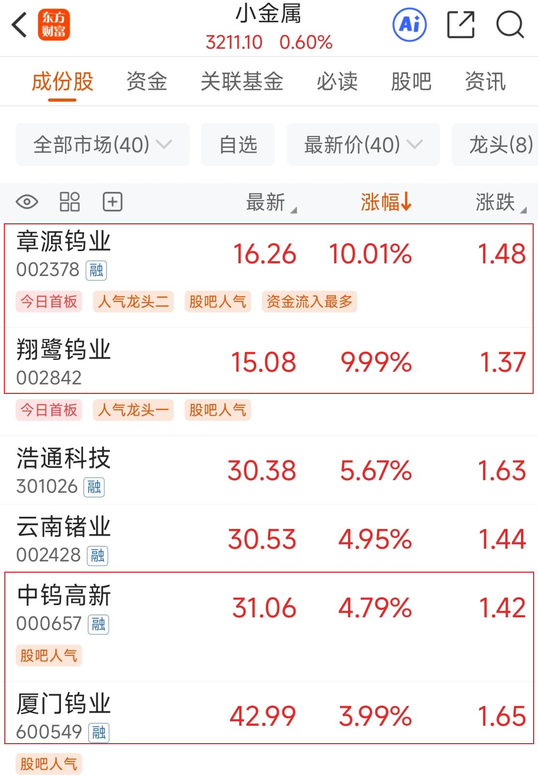 12月23日,翔鹭钨业(SZ002842,股价15.08元,市值44.86亿元)与章源钨业(SZ002378,股价16.26元,市值177.57亿元)强势封死涨停板,厦门钨业 (SH600549,股价42.99元,市值656.31亿元)和中钨高新(SZ000657,股价31.06元,市值675.38亿元)的股价也大幅上涨。 | 东方 财富 | 小金属 | | (Ai) | U Q | | --- | --- | --- | --- | --- | | | 3211.10 0.60% | | | | | 资金 成份股 | 关联基金 | 必读 | 股吧 | 资讯 | | 全部市场(40) √ | 自选 | | 最新价(40) ▽ | 龙头(8) | | ◎ 品 田 | 最新 | | 涨幅↓ | 涨跌 / | | 章源钨业 002378 融 | 16.26 10.01% | | | 1.48 | | 今日首板 | 股吧人气 资金流入最多 | | | | | 翔鹭铝业 002842 | 15.08 | | 999% | 1.37 | | 今日首板 人气龙头一 | 股吧人 | | | | | 浩通科技 301026 融 ...