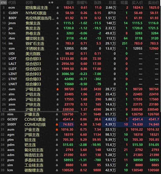 基本金属普涨 沪铜、贵金属续刷新高 碳酸锂涨逾8% 氧化铝涨超5%