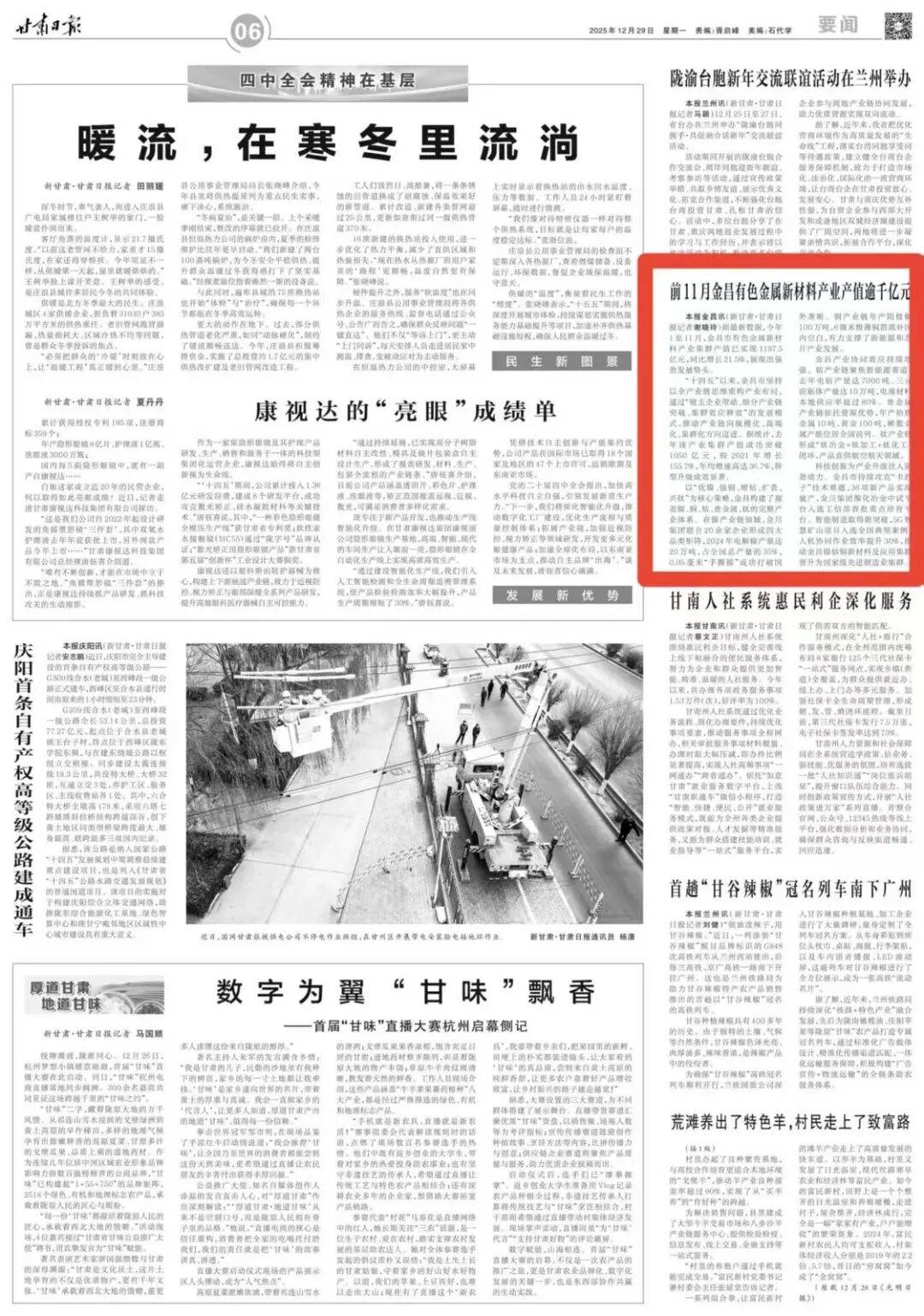 《甘肃日报》报道:前11月金昌有色金属新材料产业产值逾千亿元