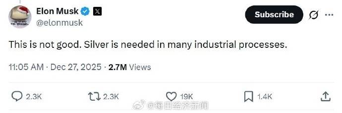 马斯克担忧白银暴涨:许多工业生产需要用到白银;今年白银价格已上涨超过170%