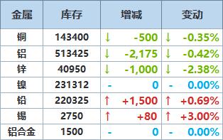 》查看更多金属库存信息 | 金屋 | 阵存 | 增减 变动 | | | --- | --- | --- | --- | | 铜 | 143400 | = -500 = | -0.35% | | 铝 | 513425 | ﮨﮯ -2,175 J -0.42% | | | 锌 | 40950 | - -1,000 ↓ -2.38% | | | 皂 | 231312 | 0 - 0.00% | | | 铝 | 220325 | ↑ +1,500 ↑ +0.69% | | | 锡 | 2750 | 1 +80 ↑ +3.00% | | | 铝合金 | 1500 | 0 - 0.00% | | | LME库存 | | --- | | 金屋 | 库 | 注册仓单 | 变动 | 注销仓单 | | 变动 | | 注销占比 上日占比 | | --- | --- | --- | --- | --- | --- | --- | --- | --- | | 园 | 143400 | 133725 | 1 -0.22% | 9675 | 1 | -2.03% | 6.75% | 6.86% | | 品 | 513425 | 41267 ...