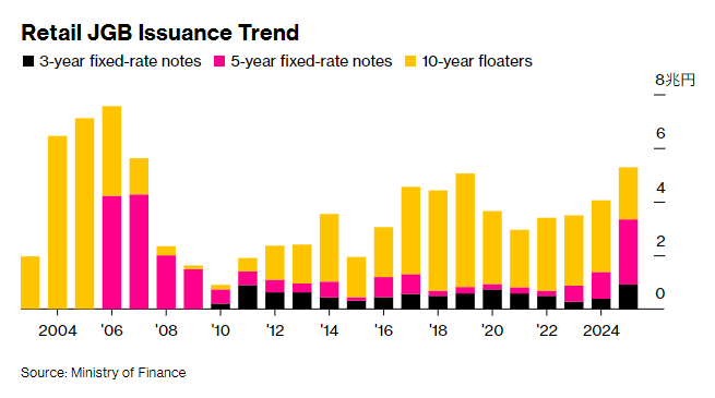 随着日本央行启动政策紧缩,利率上升正促使家庭资金从银行存款流向国债市场。今年日本面向个人投 资者的政府债券销售额已突破5万亿日元(约320亿美元),创下2007年以来最高纪录。 日本财务省数据显示,1月至12月国债发行规模累计达5.28万亿日元。其中,11月发行的五年期零售国 债票面利率达到1.22%,几乎是去年同期0.46%利率的2.7倍。 来自冈山县的37岁家庭主妇Kyoko Takahata表示,她去年10月从银行取出存款,在当地网点购入十年期 浮动利率国债。"国债利率比存款利率高,而且本金有保障,浮动计息方式让我觉得收益会随时间逐步 增长,"她坦言,"我知道这个收益跑不赢通胀,但股市波动太大,很容易亏损。"Takahata补充道,购买 国债是为子女教育和退休储备资金的更稳妥方式。 以瑞穗银行为例,即便是1000万日元以上的十年期定期存款,利率也仅约0.5%,这也从侧面解释了为 何部分储户选择将资金转向回报显著更高的国债产品。 根据最新发行安排,明年1月结算的零售型国债票面利率已确定:三年期固定利率品种为1.1%,五年期 固定利率品种为1.35%,十年期浮动利率品种为1.23%。其中,五年期利率创下20 ...