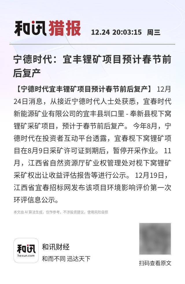 【宁德时代宜丰锂矿项目预计春节前后复产】12月24日消息,从接近宁德时代人士处获悉,宜春时代新 能源矿业有限公司的宜丰县圳口里 - 奉新县枧下窝锂矿采矿项目,预计于春节前后复产。 今年8月,宁 德时代在投资者互动平台透露,宜春枧下窝锂矿项目在8月9日采矿许可证到期后,暂停开采作业。 11 月,江西省自然资源厅矿业权管理处对枧下窝锂矿采矿权出让收益评估报告等进行公示。 12月19日, 江西省宜春招标网发布该项目环境影响评价第一次环评信息公示。 本文由 AI算法生成,仅作参考,不涉投资建议,使用风险自担 本文由 Al 算法生成,仅作参考,不涉投资建议,使用风险自担 和讯财经 和而不同 迅达天下 扫码查看原文 和讯猎报 12.24 20:03:15 周三 宁德时代:宜丰锂矿项目预计春节前 后复产 【宁德时代宜丰锂矿项目预计春节前后复产】 12月 24日消息,从接近宁德时代人士处获悉,宜春时代 新能源矿业有限公司的宜丰县圳口里 - 奉新县视下窝 锂矿采矿项目,预计于春节前后复产。今年8月,宁 德时代在投资者互动平台透露,宜春视下窝锂矿项 目在8月9日采矿许可证到期后,暂停开采作业。11 月,江西省自然资源厅矿业权管理 ...