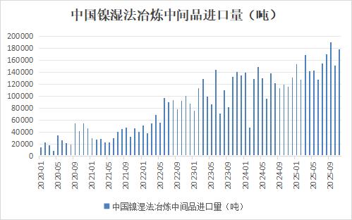 2025年11月中国镍湿法中间品进口数据 - 2025年11月中国镍湿法中间品进口量达17.85万吨,环比增加2.73万吨,增幅18.02% [1] - 2025年11月进口量同比增加6.28万吨,增幅达54.28%,创下仅次于同年9月的第二高位 [1] 主要进口来源地分析 - 2025年11月自印度尼西亚进口量为15.89万吨,环比增加18.75% [1] - 当月自印度尼西亚进口量占中国镍湿法中间品总进口量的88.99% [1] 2025年累计进口情况 - 2025年1月至11月,中国镍湿法冶炼中间品进口总量累计达170.89万吨 [1] - 2025年1月至11月累计进口量同比增加31.38% [1]