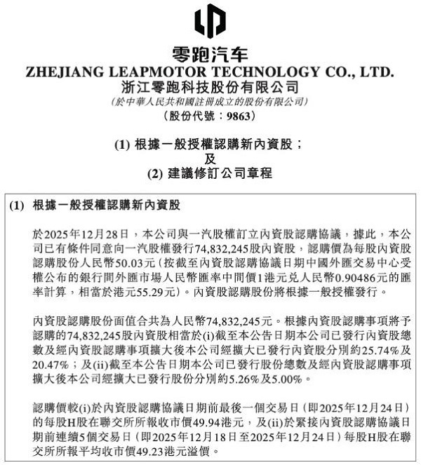 一汽集团战略入股零跑汽车 - 2024年12月29日,零跑汽车与一汽集团订立内资股认购协议,一汽股权以每股人民币50.03元认购74,832,245股内资股,总筹资约37.44亿元 [1] - 认购完成后,一汽持有的内资股占零跑汽车经扩大后总股份14.97亿股的约5.00%,同时占经扩大后内资股总数约3.66亿股的约20.47%,成为重要战略股东 [1][8] - 此次入股后,零跑汽车成为同时拥有外资Stellantis集团和国资一汽集团两个重要战略合作伙伴的民营新造车公司 [3] 股权结构变化与公司控制权 - 本轮认购后,Stellantis集团占股比例降至18.99%,创始团队朱江明、傅利泉等所属的单一最大股东集团持股比例降至22.56%,但仍为公司最大股东 [8][9] - 公司创始团队在媒体沟通会上反复强调并采取措施保证对公司的控制权,一汽和Stellantis集团在投资协议中均明确表示不谋求控股 [3][10] - 为保证实控权,公司股东朱江明及傅利泉于12月11日购入2,150,600股公司H股,将单一最大股东集团所持份额提升至23.75%,以确保在一汽认购扩股后创始团队仍为最大股东方 [13] 合作背景与历史沿革 - 零跑汽车与一汽的接触洽谈始于2022年公司生存艰难、融资受挫时期,当时曾希望与一汽-大众深度合作甚至赠送股份,一汽奔腾也曾谈过10亿元占股21%的战略投资,但未获一汽集团批准 [7] - 2023年10月,Stellantis集团以15亿欧元(当时合人民币115亿元)购买了公司21%的股份 [7] - 相比最初与一汽奔腾洽谈的10亿元占股21%的合作,本次一汽集团37.44亿元占股5%,每股价值溢价接近15倍 [7] 公司发展现状与战略 - 公司已从“不被看好”的门外汉成长为月销7万辆的造车新势力 [3] - 公司发展准则为“求稳”,选择与传统汽车巨头入股合作并坚持创始团队实控权,旨在构建稳定的股权架构以应对市场风浪 [14] - 公司重要护城河为全域自研模式,旗下有大量实体工厂,既是主机厂又是供应链 [13] - 品牌十周年之际,公司已站上年销超60万辆的新高度,但公司创始人表示现在也才刚过温饱线,要以世界级车企要求自己 [15] 资金用途与未来规划 - 本次一汽入股资金到账后,公司将把其中50%资金用于研发投入,为可持续发展提供动力 [17] - 公司产品矩阵不断完善,于2025广州车展揭幕全新A平台首款车型零跑A10,补齐了A、B、C、D四大系列矩阵,进入主流细分市场全覆盖的新阶段 [17] - 与一汽的合作有利于公司在中国市场品牌知名度的提升,加强用户信任,并实现双方优势互补 [14]