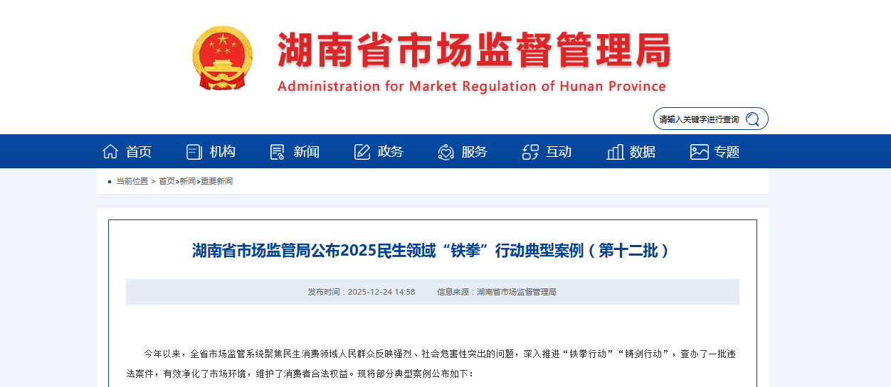 湖南省市场监管局公布2025民生领域“铁拳”行动典型案例(第十二批)