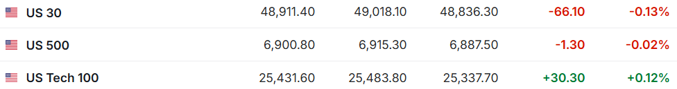 3. 截至发稿,WTI原油涨0.15%,报58.41美元/桶。布伦特原油涨0.19%,报61.88美元/桶。 1. 1月6日(周二)美股盘前,美股三大股指期货涨跌不一。截至发稿,道指期货跌0.13%,标普500指数期货跌0.02%,纳指期货涨0.12%。 | ■ US 30 | 48,911.40 | 49,018.10 | 48,836.30 | -66.10 | -0.13% | | --- | --- | --- | --- | --- | --- | | ■ US 500 | 6,900.80 | 6,915.30 | 6,887.50 | -1.30 | -0.02% | | 틀 US Tech 100 | 25,431.60 | 25,483.80 | 25,337.70 | +30.30 | +0.12% | 2. 截至发稿,德国DAX指数涨0.32%,英国富时100指数涨0.76%,法国CAC40指数跌0.44%,欧洲斯托克50指数跌0.22%。 | I 德国DAX30 | 24,934.67 | 24,952.33 | 24,836.03 | +78.35 | +0.32% | | --- ...