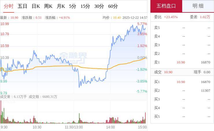 市场炒作聚焦于公司在高端材料领域的技术突破与产业布局。公司航空隔音隔热棉、核级高效水过滤材 料等产品打破国外垄断,填补国内空白,航空隔音隔热棉已实现量产并交付相关机型,高硅氧纤维与国 际知名航天公司开展商业合作,相关产品正逐步推向更多高端应用场景。 交易所数据显示,12月22日,再升科技开盘后呈现震荡调整走势,早盘阶段价格有所下探;午后开盘初 期延续震荡态势,随后在13:50左右开始逐步放量拉升,价格快速上行并持续走高,截至14:56,价格 维持在高位区间运行,午后拉升动能较强,整体走势呈现午后强势上扬的特征。 | 分时 五日 日K 周K 月K 5分 15分 30分 60分 | | 五档盘口 | | 明细 | | --- | --- | --- | --- | --- | | 最新:10,90 涨跌额:0.51 涨跌幅:+4.91% | 均价:10.40 2025-12-22 14:57 | 委比 +23.45% | | 委差 1.02万 | | 10.99 | 5.77% | 英5 | | | | | Na / W | | 1 | - | | 10.79 | 3.85% | 卖4 | - | 1 | | 1 ...