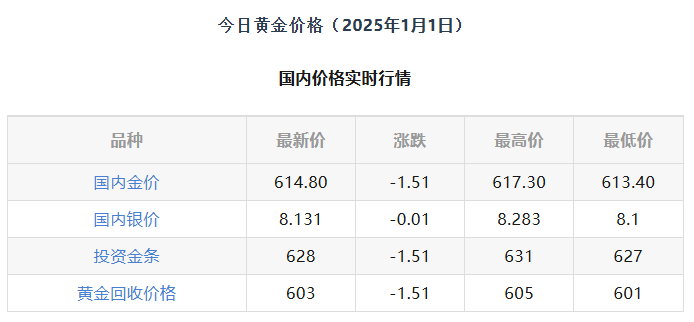 | 品枠 | 最新价 | 涨跌 | 最高价 | 最低价 | | --- | --- | --- | --- | --- | | 国内会价 | 614.80 | -1.51 | 617.30 | 613.40 | | 国内银价 | 8.131 | -0.01 | 8.283 | 8.1 | | 投资金条 | 628 | -1.51 | 631 | 627 | | 黄金回收价格 | 603 | -1.51 | ୧୦୮ | 601 | 2025年12月22日,国际黄金市场迎来里程碑时刻,现货黄金伦敦金强势拉涨,盘中突破10月20日创下的4381.484美元/盎司历史纪录,午间12:55左右首次 站上4400美元/盎司大关,截至发稿报4403.02美元/盎司,日内涨超1%。国内金价同步走高,现货金价升至990元/克,现货黄金价格年内涨幅超过67%。 2025年1月1日国际金价暂报2625.27美元/盎司,国内金价暂报614.8元/克,中国黄金基础金价617元/克,投资金条/储值金条/元宝金零售价631元/克,黄金 回收价格查询今日606元/克。 你还记得2025年1月1日的金价是多少吗? 今年以来黄金牛市态势显著,伦 ...