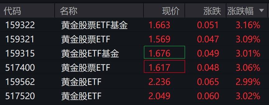 每经记者:叶峰 每经编辑:肖芮冬 黄金概念股走强,中国黄金国际涨超5%,紫金矿业、招金矿业涨超4%。 受盘面影响,黄金股相关ETF涨超3%。 | 代码 | 名称 | 现价 | 涨跌 | 涨跌幅 | | --- | --- | --- | --- | --- | | 159322 | 黄金股票ETF基金 | 1.663 | 0.051 | 3.16% | | 159321 | 黄金股票ETF | 1.569 | 0.047 | 3.09% | | 159315 | 黄金股ETF基金 | 1.676 | 0.049 | 3.01% | | 517400 | 黄金股票ETF | 1.617 | 0.048 | 3.06% | | 159562 | 黄金股ETF | 2.236 | 0.065 | 2.99% | | 517520 | 黄金股ETF | 2.049 | 0.060 | 3.02% | 有分析认为,全球央行持续购金已成为打破传统供需平衡的关键变量,而美联储货币政策转向宽松预计将进一步利好黄 金。长期来看,美元购买力变化、央行储备行为及地缘政治风险仍是影响金价的核心因素。 每日经济新闻 ...