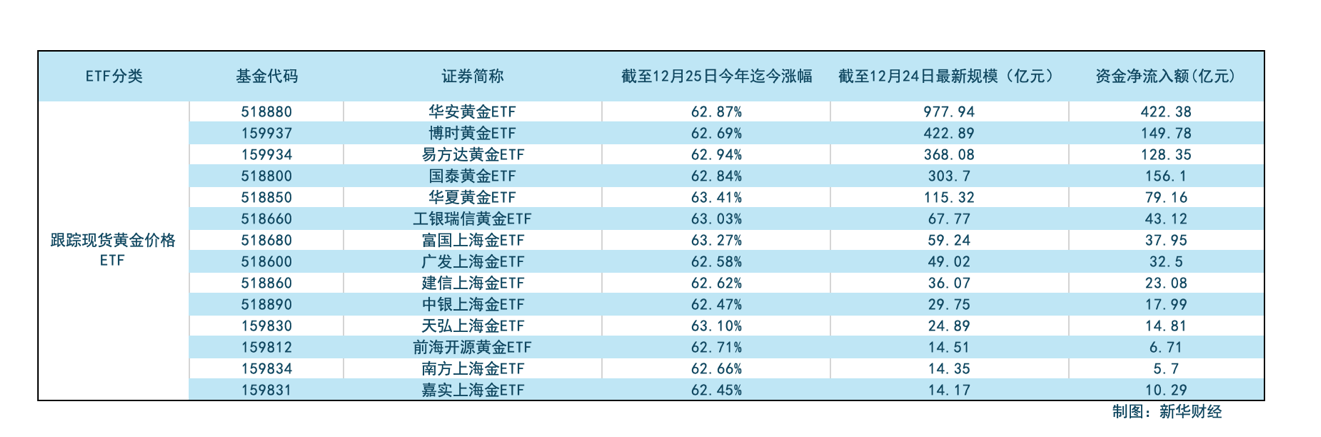 文章核心观点 - 在美联储降息、宏观秩序重构等多重因素驱动下,2025年黄金等贵金属价格创历史新高,带动相关板块走强,分析师普遍看好2026年贵金属及黄金股的持续上行前景 [1][6][10] 贵金属价格表现 - 2025年现货黄金价格年内创造54次历史新高,年内上涨超70% [2] - 现货白银价格突破47次纪录新高,国际现货白银、铂金价格上涨均超过140%,钯金上涨超100% [2] - 多数分析师看好2026年金价走势,预计目标区间在每盎司4800-5000美元 [10] - 基准预估下,预计2026年贵金属板块或还有30%左右的上涨空间 [10] 黄金ETF表现 - 14只跟踪国内现货黄金价格的ETF,2025年平均年收益率为62.83% [2] - 截至12月24日,上述14只ETF合并总规模超2497亿元,其中6只规模超百亿元 [2] - 规模最大的华安黄金ETF已逼近千亿元关口 [2] - 6只跟踪黄金产业股票的ETF今年平均涨幅达93%,表现更为亮眼 [3] 黄金概念股表现 - 多只黄金、白银概念股2025年股价翻倍,例如招金黄金年内涨幅超238%、兴业银锡超215% [4] - 山东黄金、紫金矿业、赤峰黄金、西部黄金、江西铜业、白银有色等多只概念股年内涨超100% [4] 黄金行业基本面与公司业绩 - 2025年前三季度,11家金矿股合计实现营业收入5451亿元,同比平均增长47%;归母净利润合计524亿元,同比平均增长52% [7] - 板块内所有公司均实现营收与净利润同比正增长 [7] - 紫金矿业前三季度营收为2542亿元,同比增长10.33%;实现归母净利润378.64亿元,同比增长55.45% [8] - 紫金矿业2025年上半年权益口径黄金资源量较年初新增88.8吨,规划到2028年实现矿产金年产量100吨-110吨 [8] - 招金黄金前三季度营收为3.4亿元,同比增长119.51%;净利润为8216.05万元,同比增长191.2% [8] - 招金矿业2022年至2024年业绩累计增长260.95%,2025年中报业绩进一步增长160.44% [8] 黄金股投资逻辑演变 - 黄金股上行逻辑已从金价上涨的短期交易机会,转向盈利兑现、资源扩张、效率提升和资本运作等多维度的持续演进 [7] - 金价上涨叠加产量扩张,使黄金企业呈现“量价齐升”,盈利能力提升摊薄估值水平,创造“戴维斯双击”机会 [5] - 截至三季度末,大部分主要金矿公司2026年的PE仅11倍至15倍,历史上估值中枢约20倍,具备显著估值修复空间 [7] - 贵金属定价逻辑发生深刻转变,从以美国“实际利率”和“美元指数”为核心,转向以“法币信用对冲”为核心,并由全球地缘政治与国际秩序重构所强化的多元化体系 [6] 2026年贵金属市场展望 - 驱动因素包括:官方储备与投资者资产多元化配置趋势未变、地缘政治风险、债务风险、“去美元化”等长期因素 [10][11] - 各国央行购金是结构性行情的重要推动力,部分经济体黄金储备占比仍低,存在巨大的资产重新配置潜力 [10] - 美国长债供需压力、二次通胀可能性加大、降息后西方黄金ETF可能流入等因素,也可能支撑2026年黄金行情 [11] - 摩根大通连续第四年看好黄金,将其列为2026年优先的多头配置策略 [10]