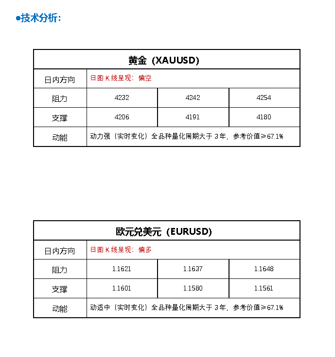 市场动态与价格表现 - 现货黄金价格在周一亚市早盘短暂下跌后飙升,并在纽约时段早盘创下六周新高 [1] - 金价在果断突破4200美元/盎司关口后继续上涨 [3] - 黄金日图K线呈现偏空,关键阻力位为4232、4242、4254美元/盎司,关键支撑位为4206、4191、4180美元/盎司 [4] - 欧元兑美元日图K线呈现偏多,关键阻力位为1.1621、1.1637、1.1648,关键支撑位为1.1601、1.1580、1.1561 [5] 驱动因素分析 - 市场对美联储本月晚些时候降息预期升温,推动金价上涨 [1] - 美联储官员的一系列鸽派言论以及美国政府停摆后疲软的经济表现,加剧了市场对美联储可能再次降息的预期 [1] - 日本央行行长植田和男发出明确信号,暗示政策委员会可能很快加息,并强调在12月会议上采取行动的可能性 [1] - 日本央行的鹰派立场对作为非生息资产的黄金构成打击 [1] 分析师技术观点 - 黄金价格依然偏向上行,但央行收紧货币政策(尤其是日本央行)以及美联储公开市场委员会意见分歧是金价上涨的主要风险 [2] - 白宫主导的俄乌冲突可能出现的解决方案,可能会在市场情绪明显转变的情况下限制金价的上涨 [2] - 金价有望测试11月13日高点4245美元/盎司,随后将冲击4250美元/盎司区域 [3] - 相对强弱指数走高,预示着金价还有进一步上涨的空间 [3] - 假如金价突破4250美元/盎司,有望进一步升向4300美元/盎司,下一个阻力位将是历史高点4381美元/盎司 [3] - 黄金动能被评估为动力强,其量化周期大于3年,参考价值≥67.1% [4] - 欧元兑美元动能被评估为适中,其量化周期大于3年,参考价值≥67.1% [5] 今日关键市场指标 - 15:00 英国11月Nationwide房价指数月率 [5] - 18:00 欧元区11月CPI年率初值 [5] - 18:00 欧元区11月CPI月率初值 [5] - 18:00 欧元区10月失业率 [5]