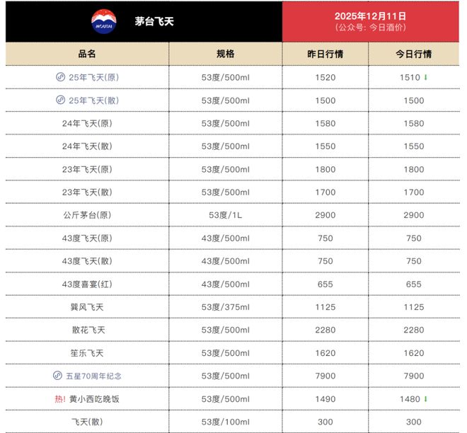 核心观点 - 2025年12月11日 贵州茅台旗下核心产品飞天茅台的批发参考价出现分化 其中25年飞天茅台(原箱)价格较前一日下跌10元至1510元/瓶 而25年飞天茅台(散瓶)价格则持平于1500元/瓶[1] - 同日 另一款产品“热!黄小西吃晚饭”价格也下跌10元至1480元/瓶 其余监测的茅台产品价格均保持稳定[2] 产品价格变动详情 - **25年飞天茅台(原箱)**:价格由1520元/瓶下跌至1510元/瓶 单日跌幅约0.66%[1][2] - **25年飞天茅台(散瓶)**:价格维持在1500元/瓶 与前一日持平[1][2] - **热!黄小西吃晚饭**:价格由1490元/瓶下跌至1480元/瓶 单日跌幅约0.67%[2] 产品价格稳定详情 - **24年飞天茅台**:原箱价1580元/瓶 散瓶价1550元/瓶 均与前一日持平[2] - **23年飞天茅台**:原箱价1800元/瓶 散瓶价1700元/瓶 均与前一日持平[2] - **公斤茅台(原箱)**:价格维持在2900元/瓶[2] - **43度系列产品**:43度飞天(原箱/散瓶)价格均为750元/瓶 43度喜宴(红)价格为655元/瓶 均与前一日持平[2] - **其他特色产品**:翼风飞天(1125元/瓶)、散花飞天(2280元/瓶)、笙乐飞天(1620元/瓶)、五星70周年纪念(7900元/瓶)、100ml飞天(散瓶)(300元/瓶)价格均与前一日持平[2]