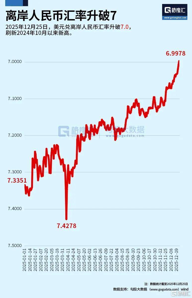 文 |无言 2025年12月25日中午,离岸人民币对美元汇率升破7这个关键整数关口。 截至当天,人民币对美元汇率从年初到现在已经升值不少,创下了2024年10月以来的新高。 同一时间,A股市场也传来好消息,中午收盘时上证指数已经实现7连涨,深证成指和创业板指也累计 达成5连涨。 这两个信号凑到一起,让不少投资者都在琢磨,市场是不是要借着这股劲儿,拉开春季行情的序幕了? 人民币破7,支撑力在哪 人民币能强势升破7,不是凭空出现的情况。 核心支撑还是来自美联储的货币政策调整。 2025年美联储连续降息,这直接导致美元表现疲软。 从美元指数就能看出来,全年跌了不少,不光是对人民币贬值,对欧元、英镑、日元这些主要国际货 币,美元也都出现了贬值。 美元一弱,全球资金的流向就会发生变化。 本来不少资金都盯着美元资产,现在美元信用有所削弱,这些资金就开始往新兴市场转移。 人民币资产作为新兴市场里的重要选项,自然吸引了不少关注,这也为人民币升值添了一把力。 可能有人会觉得,不就是一个汇率关口破了吗?其实不然,这个关口的突破,更多是市场信心的一种体 现,说明大家对人民币资产的认可度在提升。 A股连涨,量能藏玄机 A股和人民币升 ...
