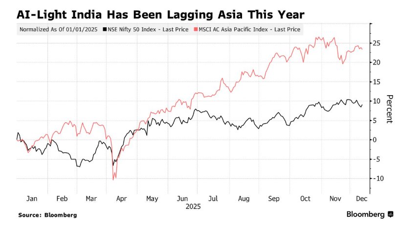 全球大型资管机构们正在把印度股票市场视为对冲AI泡沫破裂风险的首选市场标的,随着近期甲骨文、英伟达以及博通等 近年来受益于AI热潮的科技巨头们股价大幅下跌,市场对于AI泡沫破裂的担忧情绪显著升温,惧怕出现"堪比2000年互联 网泡沫破裂时期的科技股熊市暴跌轨迹"。而印度市场,正引起全球对冲基金经理们的新增关注,他们希望在来年分散股 票投资风险。 来自欧洲的资管巨头Aberdeen Group Plc认为印度股票明年会出现反弹;另外两家资管巨头Principal Asset Management Co.与 Eastspring Investments则认为,印度市场与"AI叙事"交易的相关性较低,可作为对冲其他股市(尤其是科技股集中度很高的 股市——比如美国、韩国以及中国台湾)的重要工具。来自汇丰与Jefferies Financial Group Inc.的资深策略师们也表达了类 似观点。 全球资金开始将印度股市视为抵御人工智能风险的对冲工具 "印度在2026年可以成为投资组合中一个很好的分散化与多元化资产配置,因为它与其他偏向AI的大型市场的相关性较 低,而AI交易热潮一旦暂停,资金就会大规模流向印度,"P ...
