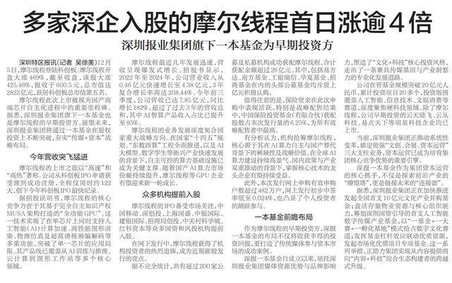 【深圳特区报】多家深企入股的摩尔线程首日涨逾4倍 深圳报业集团旗下一本基金为早期投资方