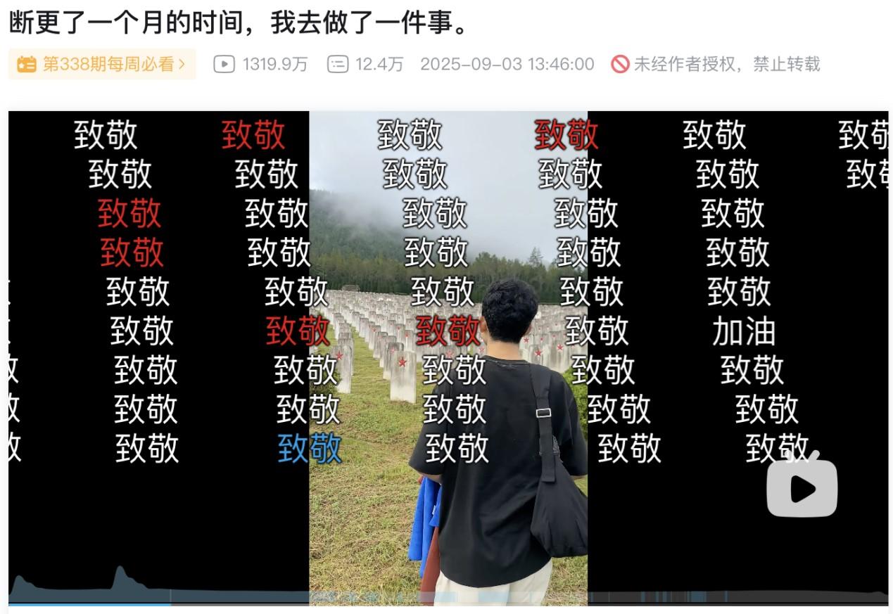 据了解,2025年第一条致敬弹幕发布在UP主"小何教官-铁手版"的视频中,去致敬因为意外截肢却依然 乐观享受生活的精神。由UP主"江汤锅底呀"发布的视频,记录了UP主受到老兵委托去帮忙清理烈士陵 园的的过程,收到了109962条致敬,是今年收到致敬最多的视频。 据了解,2025年第一条致敬弹幕发布在UP主"小何教官-铁手版"的视频中,去致敬因为意外截肢却依然 乐观享受生活的精神。由UP主"江汤锅底呀"发布的视频,记录了UP主受到老兵委托去帮忙清理烈士陵 园的的过程,收到了109962条致敬,是今年收到致敬最多的视频。 责任编辑:江钰涵 12月27日午间消息,哔哩哔哩(以下简称:B站)官宣2025年度弹幕为"致敬",全年发送量超2282万 次,发送用户超459万人,其中80%为00后,是今年增长最快的弹幕新热词。 12月27日午间消息,哔哩哔哩(以下简称:B站)官宣2025年度弹幕为"致敬",全年发送量超2282万 次,发送用户超459万人,其中80%为00后,是今年增长最快的弹幕新热词。 责任编辑:江钰涵 ...