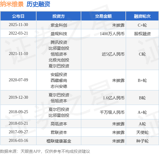 公司融资历史 - 北京纳米维景科技有限公司于2025年11月30日完成C+轮融资,投资方包括紫金科创,具体融资金额未披露[1] - 公司于2021年11月10日完成C轮融资,融资金额近5亿人民币,投资方包括腾讯投资、比邻星创投、恒旭资本、北极光创投、夏尔巴投资[2] - 公司于2019年12月30日完成B轮融资,融资金额为1.6亿人民币,投资方包括夏尔巴投资、恒旭资本[2] - 公司于2018年9月25日完成A+轮融资,融资金额为千万级人民币,投资方包括夏尔巴投资、比邻星创投[2] - 公司于2018年3月21日完成A轮融资,投资方为高瓴资本,金额未披露[2] - 公司于2017年9月27日完成天使轮融资,投资方为君联资本,金额未披露[2] - 公司于2016年3月16日完成种子轮融资,投资方为楹联健康基金,金额未披露[2] - 公司于2022年3月21日获得盛视科技1400万人民币的股权融资[2] - 公司于2020年7月9日完成B+轮融资,投资方包括安招投资、西藏睿尚、志兴安德,金额未披露[2] 公司业务与产品 - 公司致力于国产X射线探测器及静态CT的自主研发[2] - 公司产品主要应用于医疗、安检和工业三种场景[2] - 在医疗领域,主要产品为CMOS探测器和新一代计算机断层扫描(CT)解决方案,应用覆盖计算机断层扫描、牙科X射线成像、骨科X射线成像、乳腺X射线成像和其他医疗应用[2] - 在安检领域,产品应用于行李、货物安检的X射线成像,公司提供探测器核心部件及解决方案[2] - 在工业领域,产品提供PCBA检查、锂电池检查、机械部件检查等工业无损检查应用[2]