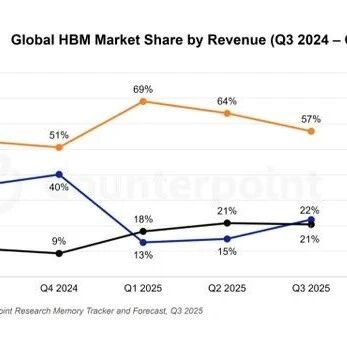 公众号记得加星标⭐️,第一时间看推送不会错过。 今年第三季度,三星电子超越美光科技,重夺高带宽内存(HBM)市场第二的位置。此前,该公司 在第一季度和第二季度一度落后于美光,位居第三,但随着HBM3E(第五代)产品供应量的增加, 其市场份额呈现回升趋势。在DRAM市场,三星也紧随领先企业SK海力士之后。 据市场研究公司Counterpoint Research 12月19日发布的数据显示,三星电子第三季度全球HBM市 场份额(按营收计)达到22%,较上一季度的15%大幅增长7个百分点。同期,美光科技的市场份额 为21%,被三星电子超越,位居第二。 三星电子在整体DRAM市场也展开了激烈的争夺。在第三季度基于营收的DRAM市场份额排名中, SK海力士以34%的份额稳居榜首,三星电子紧随其后,市场份额为33%,两家公司之间的差距仅为 1个百分点。SK海力士在今年第一季度实现了突破,历史上首次超越三星电子,荣登DRAM营收榜 首。三星电子自1992年以来一直占据半导体行业霸主地位,如今却跌至第二位,这在半导体历史上 是前所未有的。三星电子的市场份额从第二季度的32%提升至第三季度的33%,重夺第一的希望越 来越大。 ...