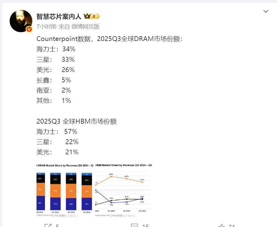 2025年第三季度全球DRAM市场格局生变,海力士持续领跑